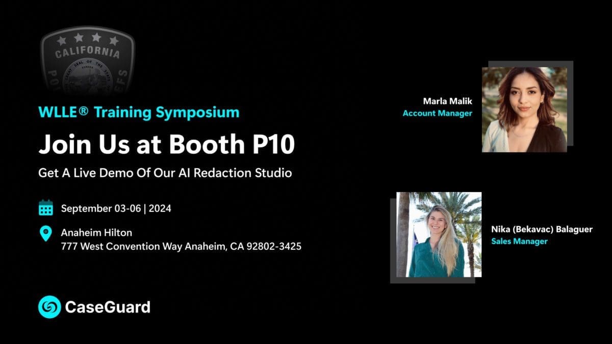 CaseGuard estará presente en el próximo Simposio de capacitación para mujeres líderes en el cumplimiento de la ley en el Anaheim Hilton, ubicado en 777 West Convention Way, Anaheim, California. Visite a nuestro equipo en el stand P10 para conocer CaseGuard Studio y sus avanzadas funciones de redacción de IA.