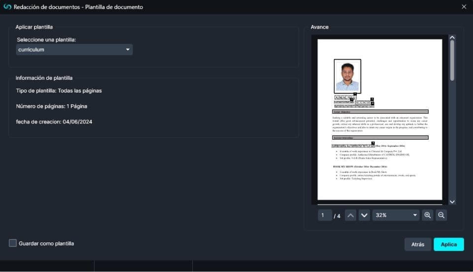 Aplicar plantilla. Aparecerá la ventana Aplicar plantilla PDF, donde podrá previsualizar y aplicar la plantilla.