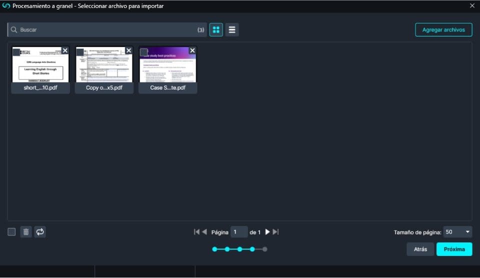 - Oprima en “Próxima” y comience a añadir sus archivos a CaseGuard Studio. No hay límite en el número de archivos que se pueden añadir al Procesamiento masivo, lo que lo convierte en la herramienta perfecta para llevar a cabo tareas de gran envergadura de forma eficiente.