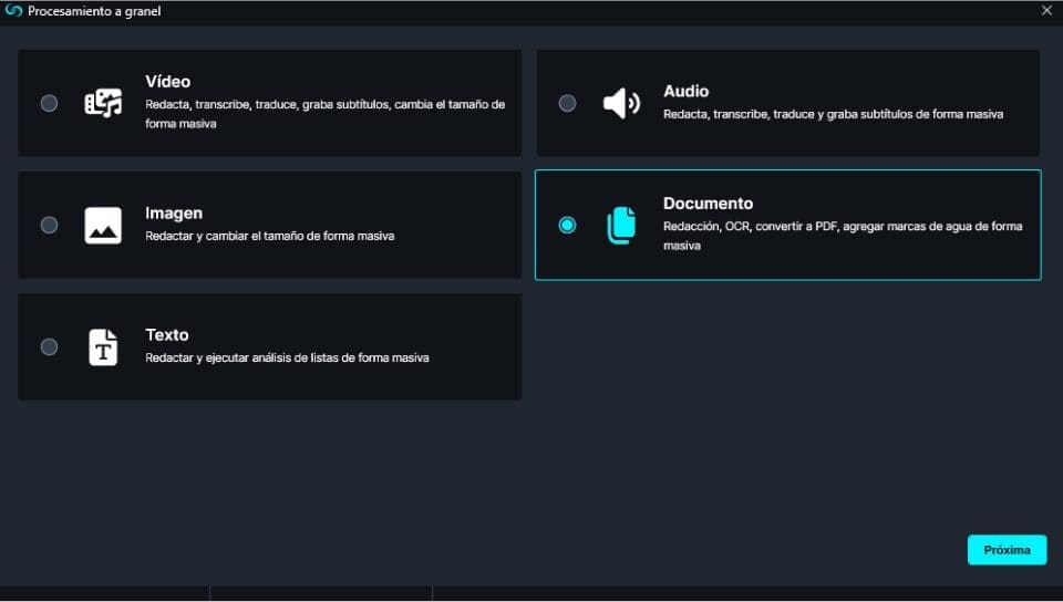 - Seleccione “Reconocimiento óptico de todas las páginas” y oprima en “Próxima“.