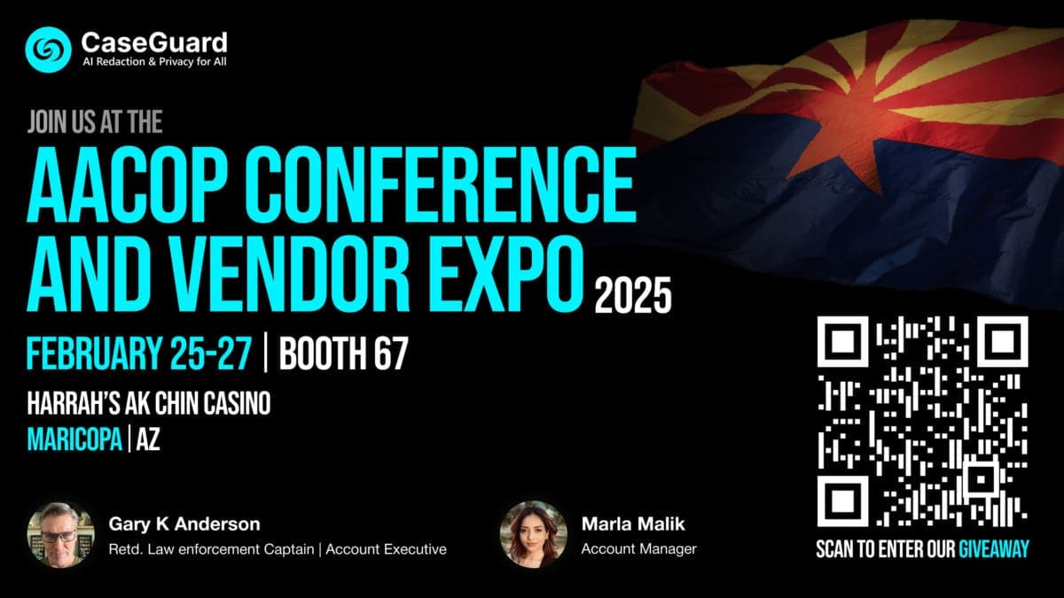 CaseGuard will be exhibiting at the upcoming Arizona Association of Chiefs of Police conference in Maricopa, Arizona. Visit our team at Booth 67 to learn about CaseGuard Studio and its advanced AI redaction features.
