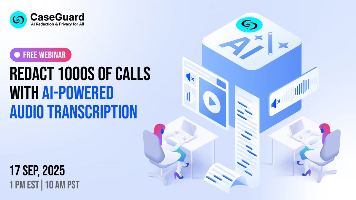 Join us for the latest session in our Redaction & Investigation Webinar Series to see how agencies are transforming their workflows with AI Audio Redaction, AI Transcription, and AI Translation using CaseGuard. Whether you handle customer calls, 911 calls, public records requests, or sensitive investigations, this webinar will show you how to streamline operations and cut redaction time by over 80%.
