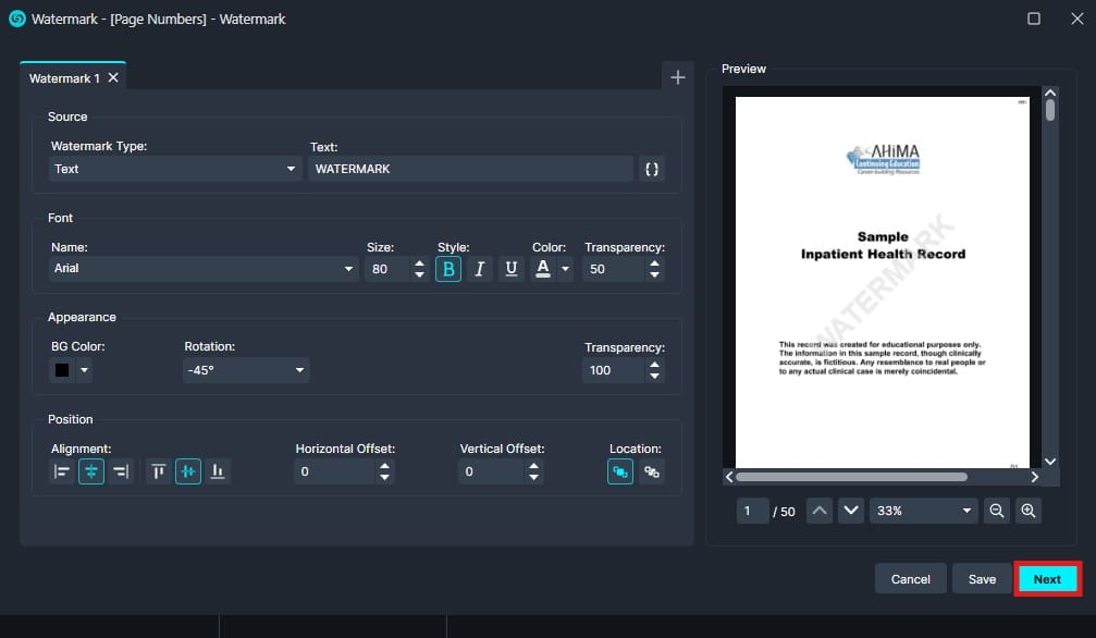 Now that the tag is added, you can customize the appearance of the page numbers in the watermark window. You can also see the changes you made using the preview window to the right. Options include: