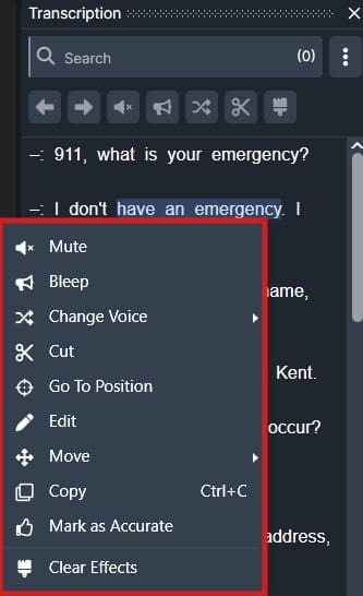- You can also use the search bar in the Transcription Panel to search for the word or phrase you would like to “Redact” or “Edit” and press enter. All instances of the word/phrase in the audio will be highlighted in the Transcription panel.