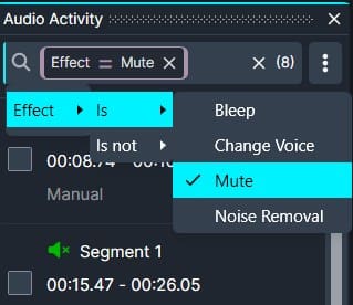 - To search for a specific type of effect, click the Search bar, select “Effect” then “Is”, and then select the Category of effect you would like to see.