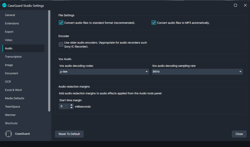 - If you are working with older audio recorders, such as Sony’s IC Recorder, we recommend selecting the “Use older audio encoders” option within the “Audio” tab. This will ensure your audio is handled properly by CaseGuard Studio.
