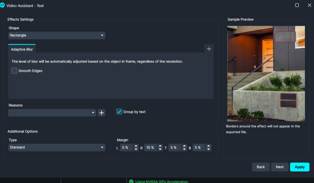 - Apply the shape and Effect per object. The default is a Rectangle shape; add effects using the “Add Effect” dropdown. Selected Effect will appear in the Sample Preview image on the right.