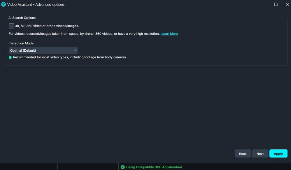 - In the Advanced Options window, optimize object detection if the video is unsteady and optimize detection for 360 Videos, 4K, 8K, or Drone Footage (if needed).