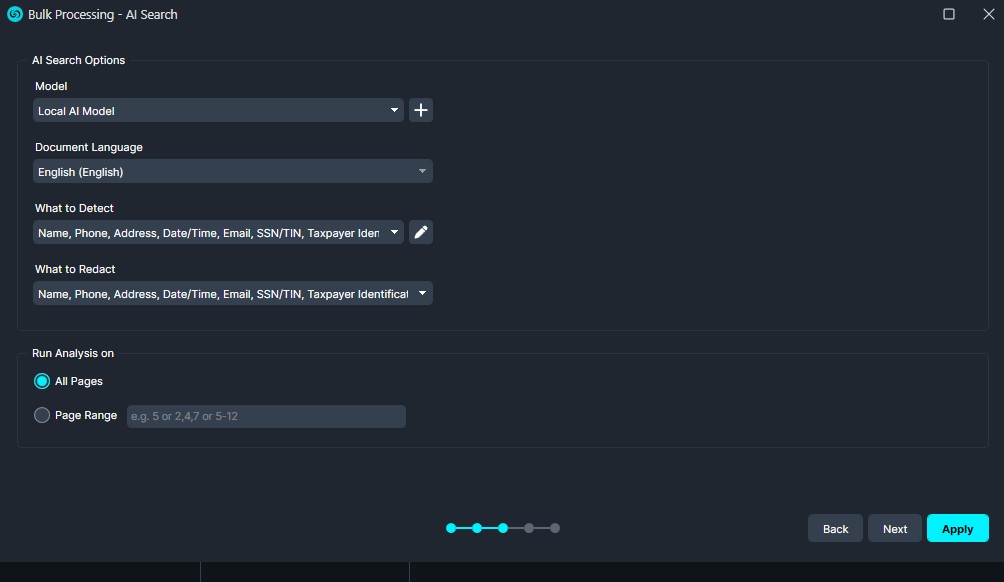 The AI Text Analysis function within the Bulk Processing allows users to automatically redact Personal Identifiable Information (PII) in all documents without performing any manual redactions.