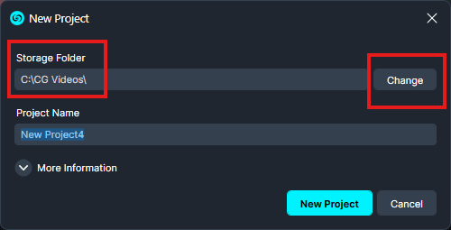 In the New Project window, click Change beside the Storage Folder field.
