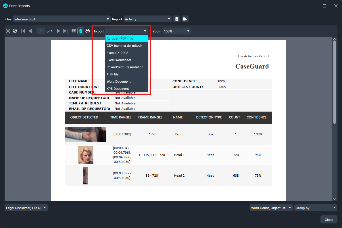 CaseGuard Studio allows you to review the confidence levels of AI-detected objects in your videos, ensuring transparency and accuracy in your redactions. Follow these steps to generate a clear and actionable report: