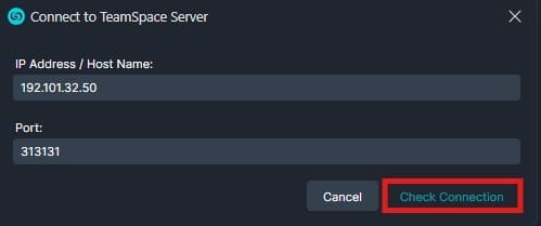After entering the IP address and port, click Check Connection. If successful, click Done, and your TeamSpace server should now be visible.