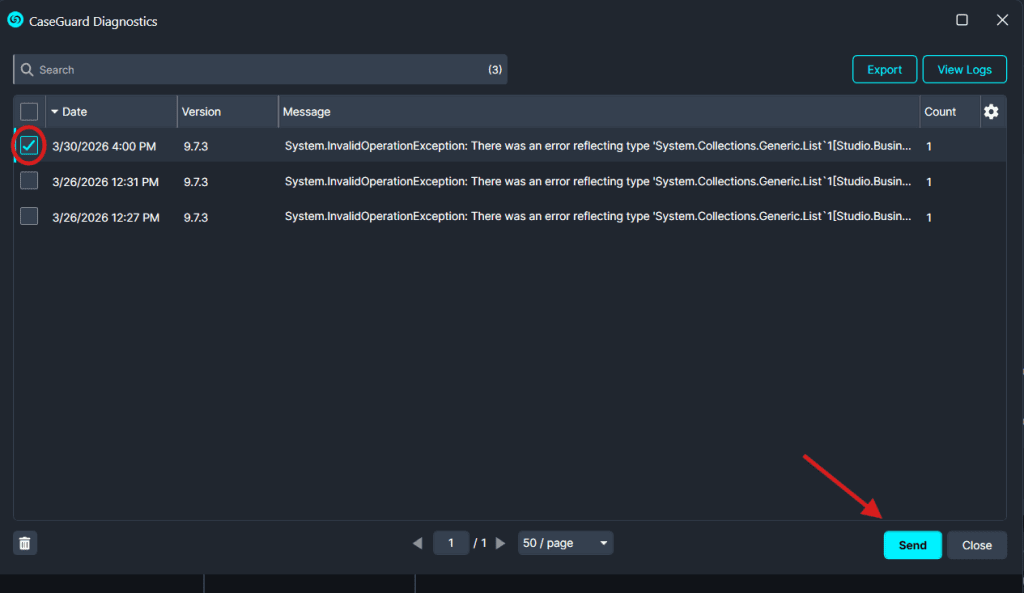 If you encounter a technical issue while using CaseGuard, the software’s diagnostic feature can help. When a problem arises, a red diagnostic icon will appear. Click on this icon, and a window with your diagnostic messages will open.