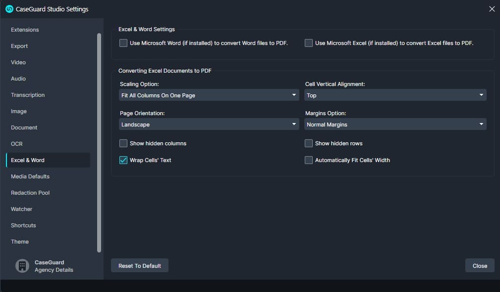 CaseGuard has extra options to convert Excel documents to PDF so they are just the way you want them. The Scaling Option setting allows you to select how you want the Excel sheet scaled to the page. You also have the option to show hidden rows and columns, Wrap Cell’s Text, Automatically FIt Cells’ Width, and change the cell alignment, page orientation, and margins.