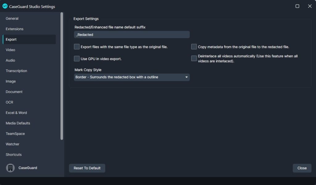 When exporting files in CaseGuard Studio, you have access to a range of settings that can be customized to suit your specific needs or those of your agency. These settings allow you to tailor the export process, ensuring that the final output aligns with your requirements in terms of format, quality, security, and other parameters.