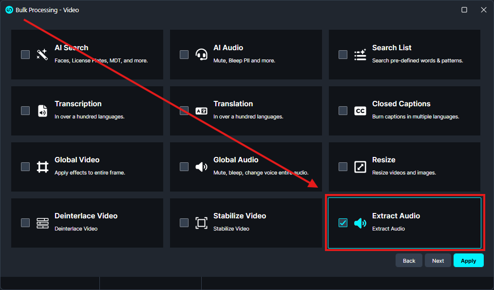 In the new window, select the Extract Audio function. Click Apply, then add the file you want to process and click Apply again.