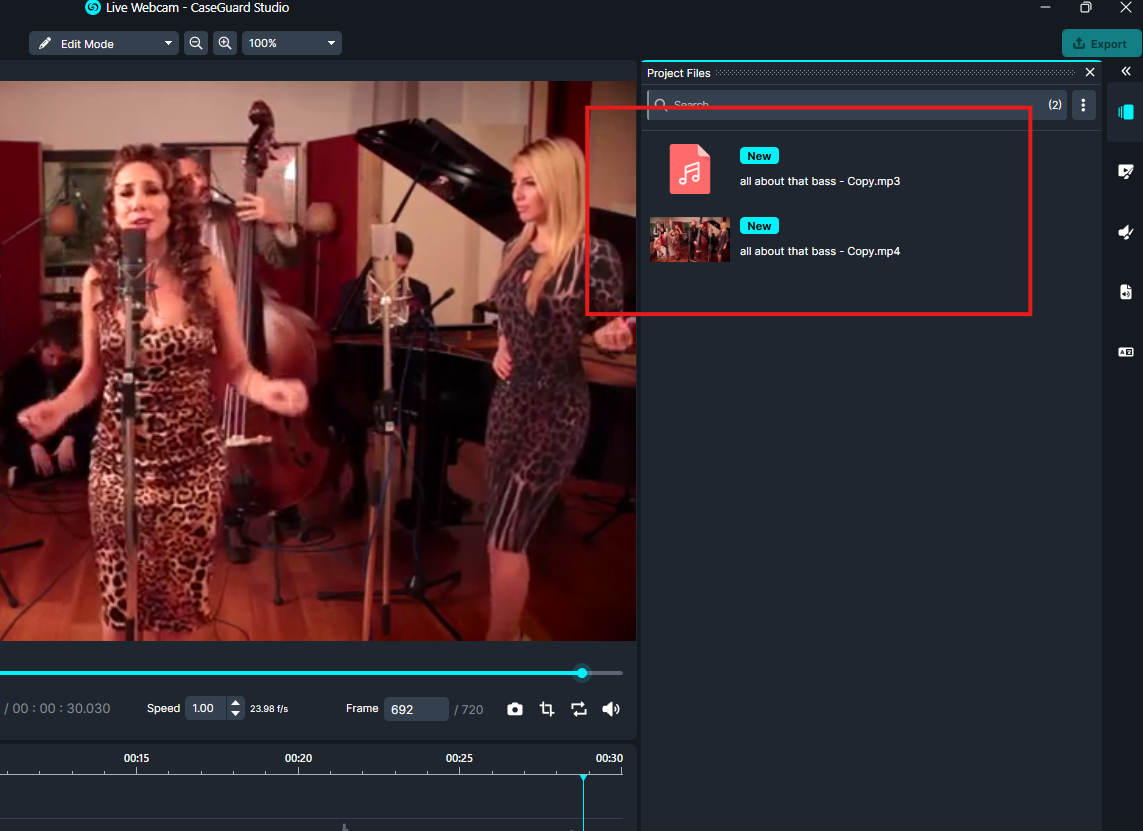 Once the process is complete, the extracted audio file will appear under Project Files on the right-hand panel. Both the audio and the original video will be available.