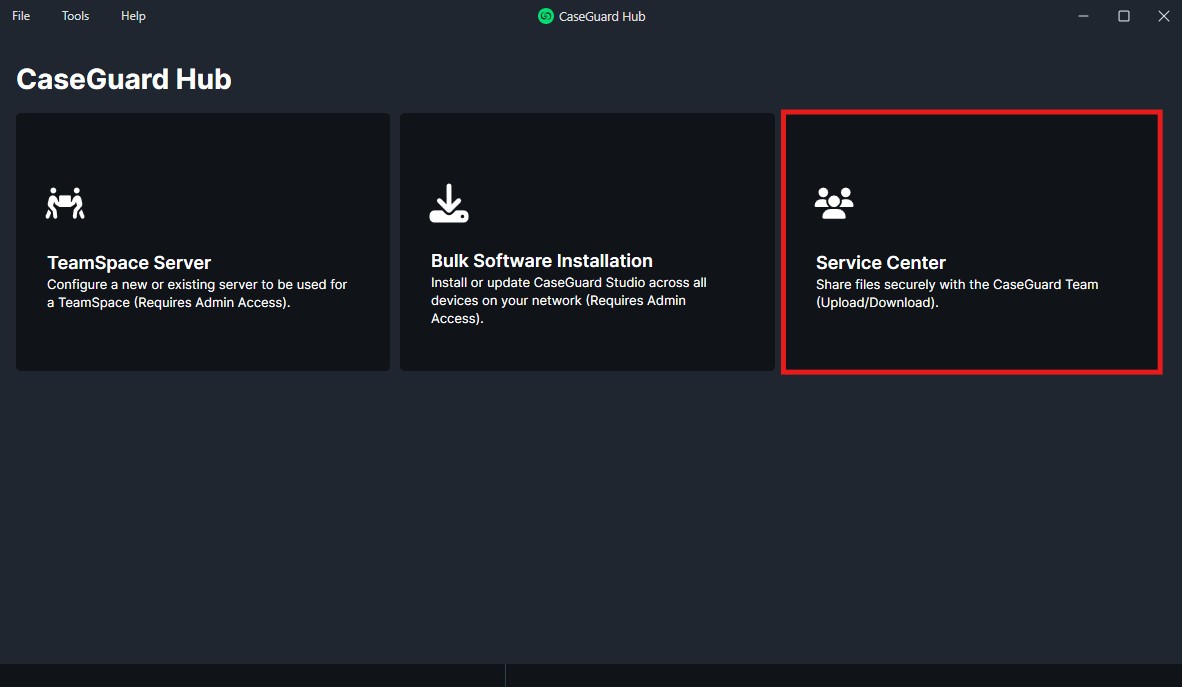 Upon launching CaseGuard Hub, you’ll see three core functionalities: