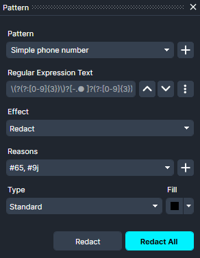 . This opens the Pattern/Regular Expressions Redaction Panel. Inside this panel, we have the ability to determine what Pattern we are looking for, what Reason we are redacting it, and what Color the redaction should be.