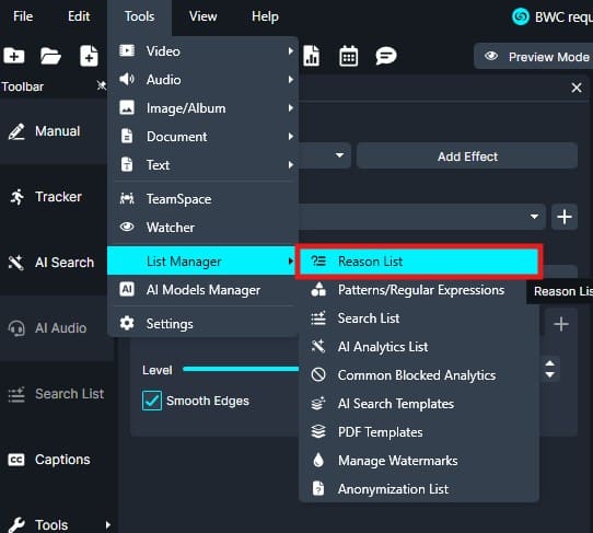- Select “List Manager” from the dropdown menu, then click “Redaction Reason.”