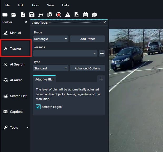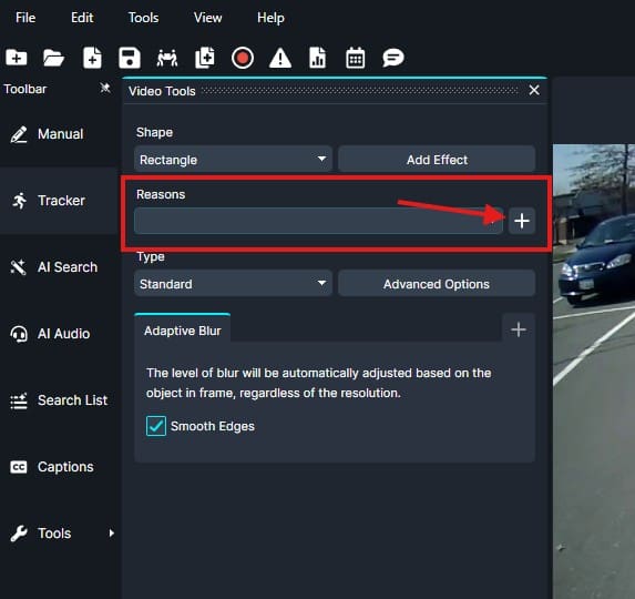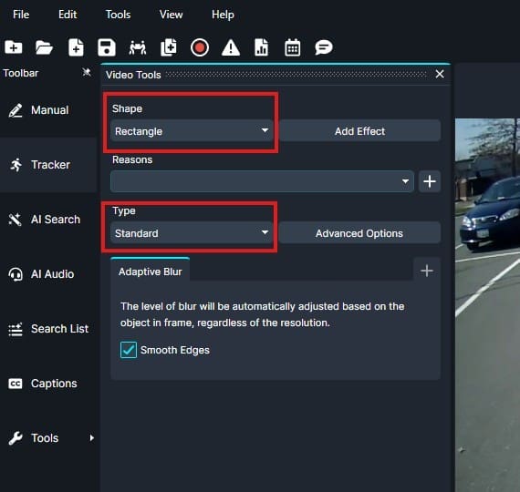 - In the Video Tools Panel, select the shape and effect for your redaction box.