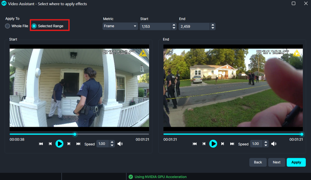 You’ll now have the option to redact the entire file or select a specific range. Define the start and end times for the range you wish to redact by either manually entering the times or adjusting the slider. Once you’ve set your desired range, click Next.