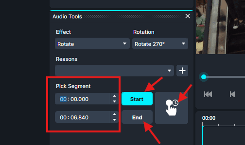 NB: This is how to pick the segment: use the up and down icons to move the segment to your desired time, then click Start. Do the same to pick the times for where you want the effect to be applied, then click End, and finally press the icon next to the Start and End. Refer to the image below.