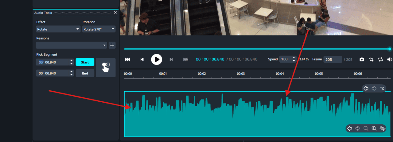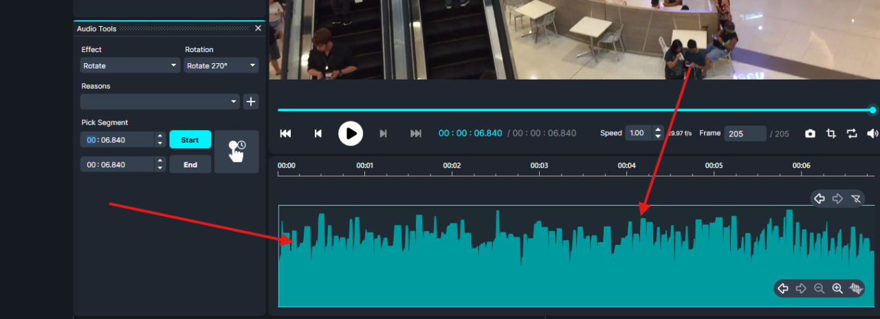 2. In the audio waveform, highlight the portion you want to rotate. ( If you want to rotate the entire video, drag across the full waveform. )