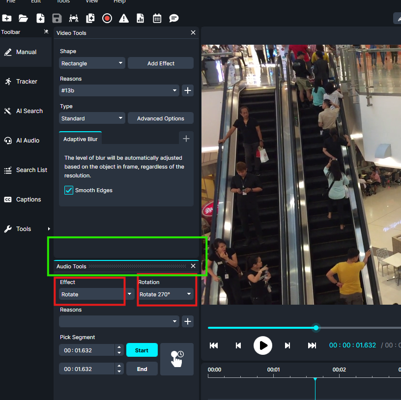 2. Select the Audio Tools, and in the dropdown effects, look for Rotate (make sure to select the required option).