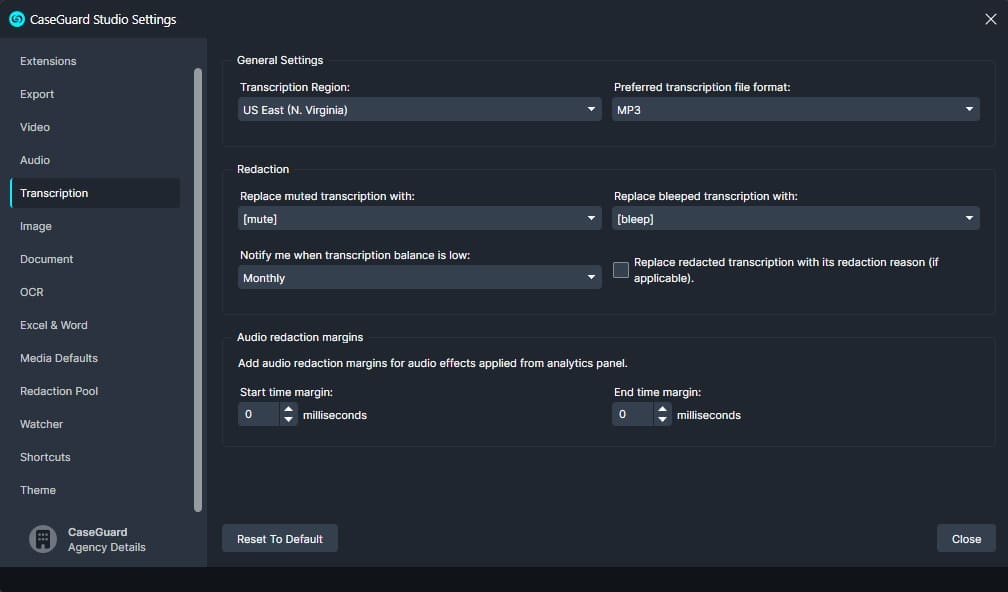 Change the region to use for CaseGuard’s Transcription. We recommend changing it to the region closest to you for the best results.