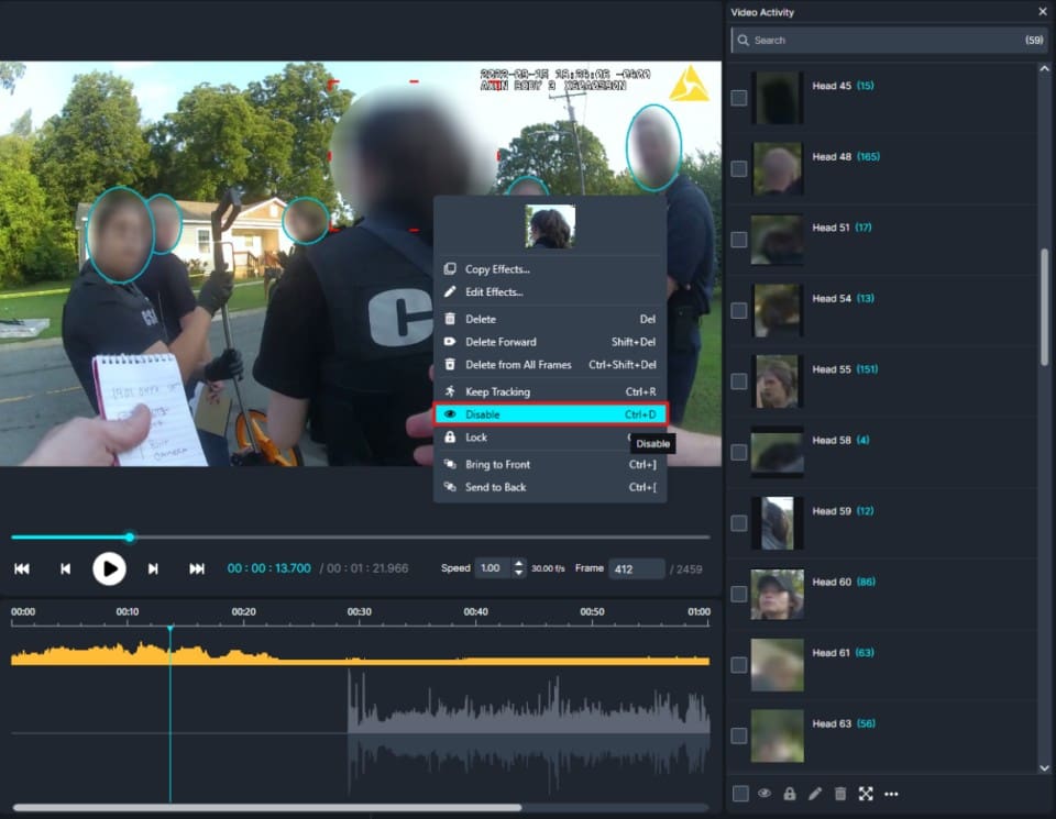 Once done, re-play the video to preview the disabled faces. If an individual was left unredacted, manually disable the face from within the video.