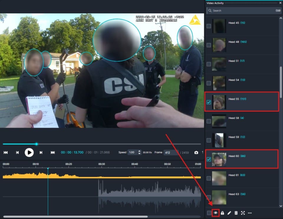Within CaseGuard, we offer multiple solutions to blur videos, based on the length, movement, and redaction criteria of the video. In a situation where the video has many people and everyone, with the exception of a few individuals, needs to be redacted, we recommend running the AI Automatic Redaction on the whole video, by selecting the objects such as “Faces/heads,” and/or “People,” and then going through the Object Detection Panel, and removing the redactions from individuals that should stay visible.
