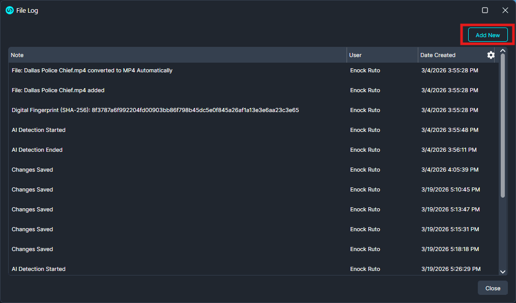 - Select the first icon (Add Note) to easily add notes to your file log.