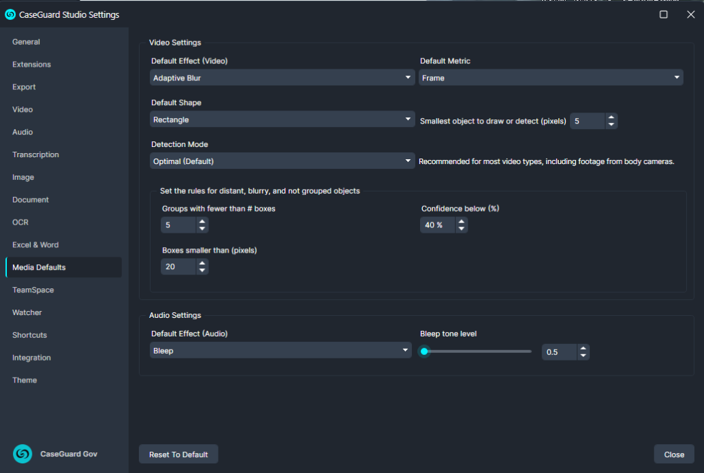 The Media Defaults tab allows you to configure CaseGuard Studio to your preferred redaction settings, streamlining your workflow and ensuring consistency across video and audio projects.