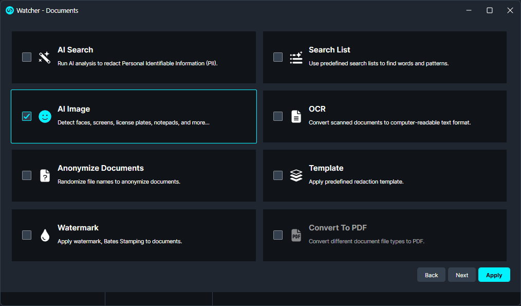 The Watchers AI Image Analysis is an advanced function that uses AI to analyze and redact images within a document. Using the AI Image Analysis feature within the Watcher, users are able to instantly redact images on unlimited files without any required input within CaseGuard after the Watcher is set up.