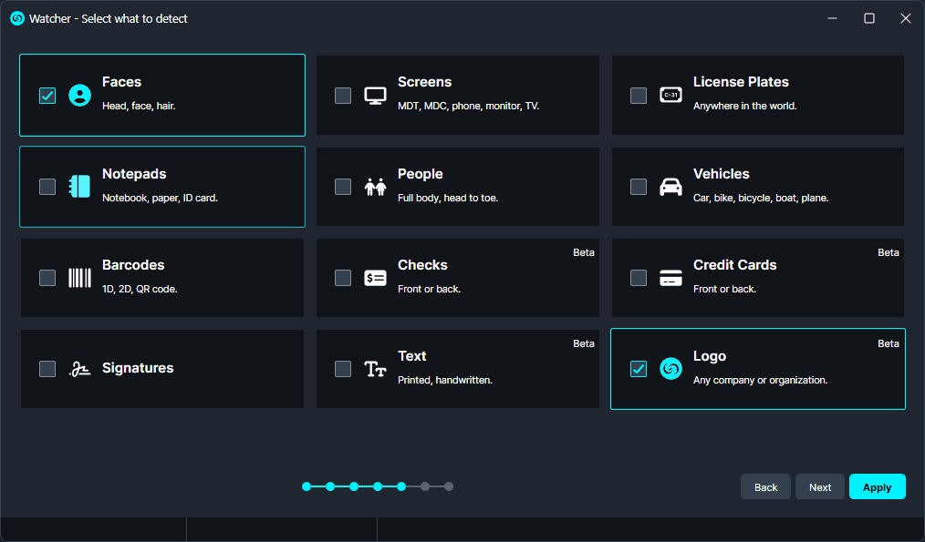 To start using the Watchers AI Image Analysis, select the AI Image Analysis option and select what you would like detected. Search results are based on selected detection options (faces/heads, license plates, vehicles, etc.) Once you select what you would like detected, add your files and the watcher will instantly begin analyzing and redacting any image selected.