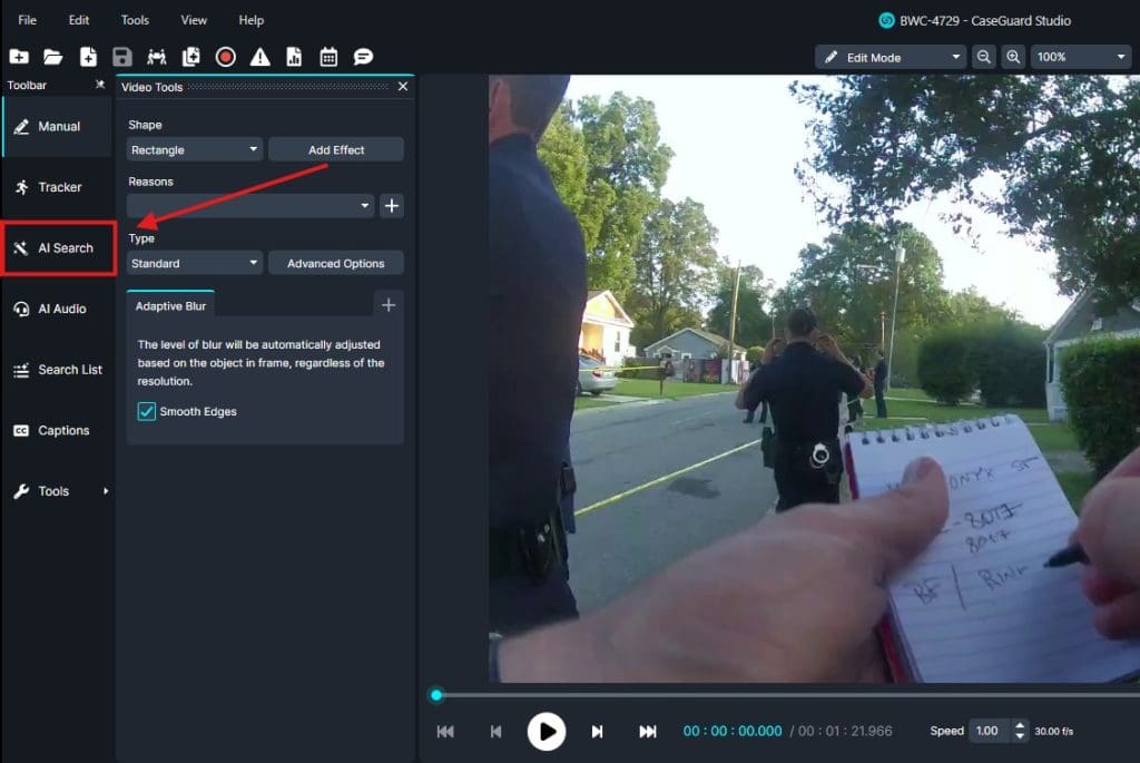 First, a video file to CaseGuard Studio. Click on AI Search located on the left side of the workspace under the Toolbar to run automatic AI detection. This will allow us to detect and blur all faces in the video.
