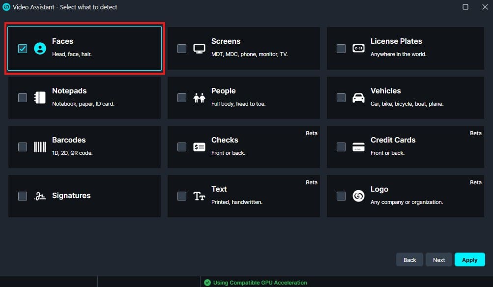 Click on the “Faces/Head.” If you would like to redact any other objects, for example, “License Plates,” just click on it to select. Then click Next.