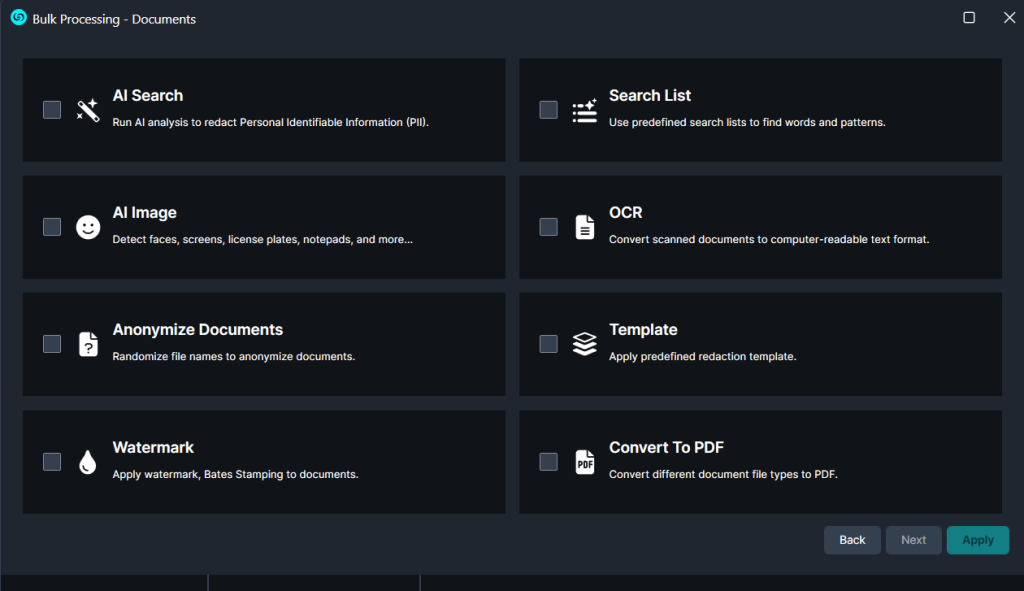 - Select “Next,” and you will be presented with various processes that can be performed on documents in bulk, including optical character recognition (OCR), AI image analysis, and template redaction.