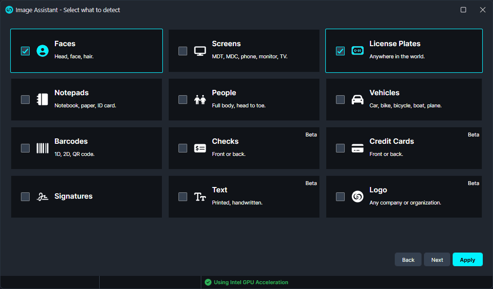 AI Image: Select AI Search to open the CaseGuard Automatic Detection popup. The system will use your chosen settings to automatically detect and apply effects to objects such as faces, screens, license plates, vehicles, bodies, and more.
