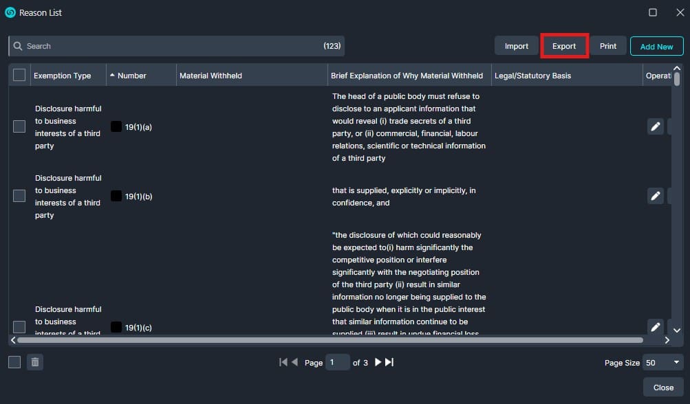 Let’s say your legal department has finalized a standardized list of redaction reasons used across case files. Rather than having each team member create the same list from scratch, one person can create and export the list, then distribute it for seamless importing. This ensures consistency, accuracy, and time savings across your team.