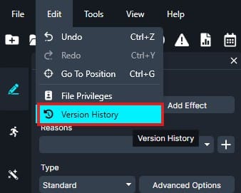 Once your project is open, click on Edit in the top-left menu bar, then select Version History from the dropdown.