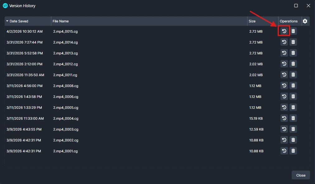 Locate the version you’d like to restore and click the rewind icon (located to the left of the trash bin icon). This will load the selected version.