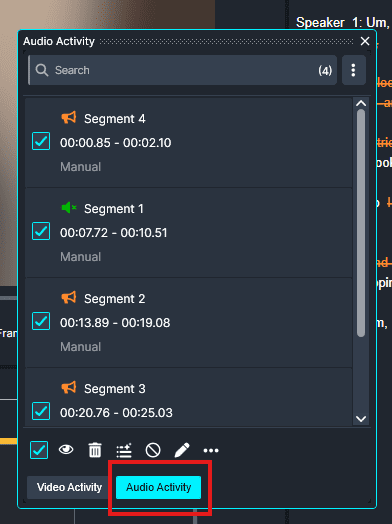 Navigate to the Audio Activity panel located next to the Video Activity panel. This will display all detected and applied audio activities.