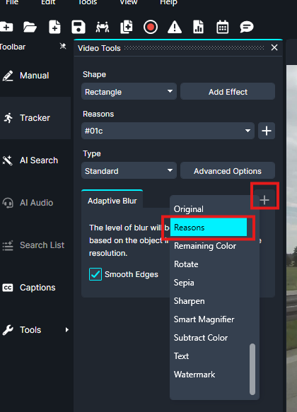 After selecting your desired reason from the dropdown, click the “+” icon , then select Reasons, then manually draw the redaction over the object you want to redact.