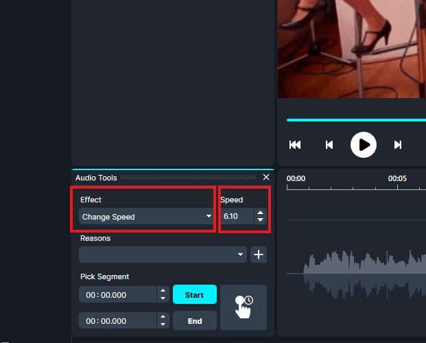 At the bottom Audio Too, next to the audio waveform, click Effect → Change Speed. Then select your desired speed from 1.00 to 10.00.
