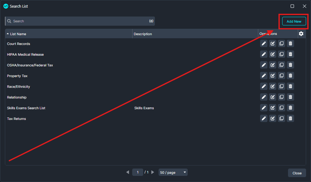 - Once the Search Lists window opens select Add New in the top left.