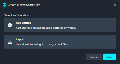 - In the next window select Add Entries or Import Entries if you already have a created list then click Next.