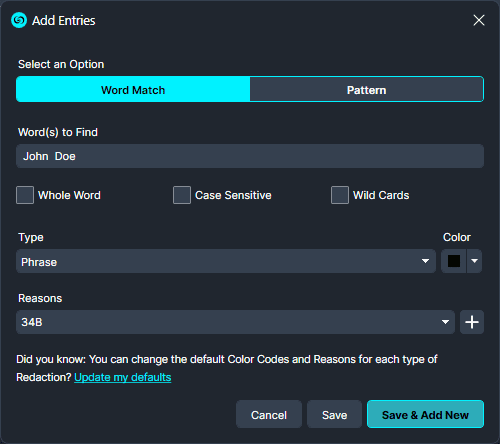 - Now customize your list with the words and patterns you would like to be found in your document and transcription. Once all your entries are added select Save & Close.