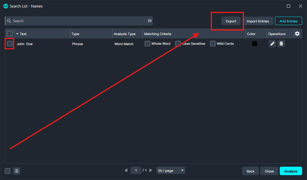- Once your list has been saved, select the items you want to share and click Export to create a copy of the list. After exporting, you can send the Find and Redact list to any co-workers who need access.|